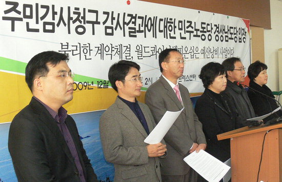 민노당 경남도당은 16일 오후 2시 도청 프레스센터에서 기자회견을 열어 이 같은 계획을 밝혔다. 기자회견에는 이병하 도당위원장, 김미영 도의원, 문순규 마산시위원장, 송철원 주민감사 청구 대표 등이 참석했다. 도당은 이 자리에서 문화관광부의 감사 결과에 몇 가지 문제점이 있다고 지적했다.