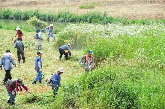 24일 오후 무더운 날씨 속에 일꾼들이 창원천에서 잡초 제거 등 하천 청소 작업을 하고 있다.