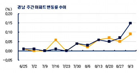 지난주 경남 아파트 매매시장은 매매가가 0.09% 상승해, 한 달 넘게 오름세를 보이고 있다. 특히, 가을 이사철이 다가오면서 전체적으로 102~115㎡의 중소형 면적 매매가가 많이 올랐다.