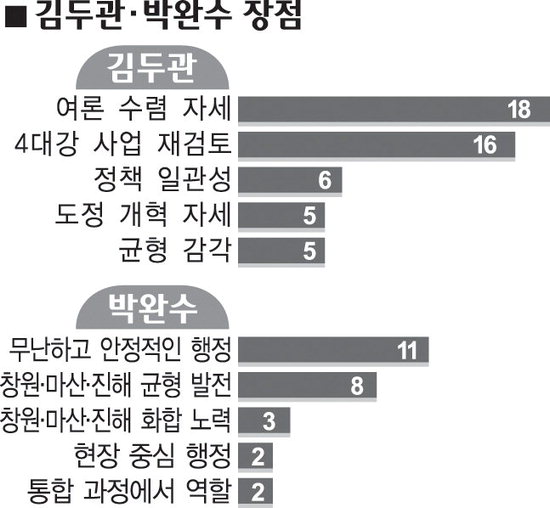 한 시민단체 관계자도 "창원시정을 통해 행정 안정성은 충분히 증명했다고 본다"며 "마산·진해지역 소외감을 덜어줄 수 있는 정책을 꾸준히 내놓는다면 훌륭한 평가를 받을 것"이라고 말했다.