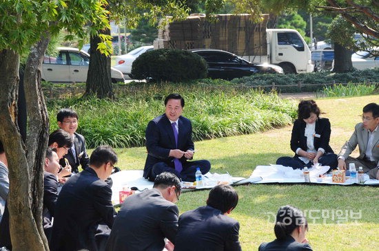 '잔디밭 미팅'은 녹록하지 않았다. 실·국별 6급 이하 직원 20여 명이 참석한 가운데 18일 오전 도청 앞 잔디밭에서 진행된 지사와 직원의 만남은, 저마다 자리 앞에 놓인 김밥과 과자가 무색할 만큼 진지했다.