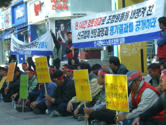 면허 취소된 (유)시민버스를 대체할 시내버스 노선운영 우선 사업자로 대운교통㈜이 선정된 것과 관련, 전 시민버스 노동조합원 50여 명이 면허사업자 선정 취소 촉구대회를 열었다.