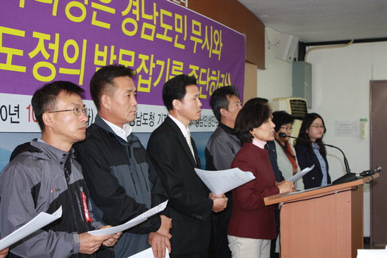 민생민주경남회의는 26일 오전 11시 도청 프레스센터에서 기자회견을 열고 조직개편안을 수정 의결한 도의원과 최근 도청을 방문해 4대강 반대로 예산에 차질이 빚어진다며 반협박 한 한나라당 국회의원들에게 쓴소리를 했다. '경남도민을 위해 존재하는지, 중앙정부와 한나라당의 시녀 역할을 하려고 존재하는지 분간할 수가 없다'는 것이다.