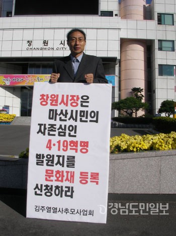추모사업회는 "창원시장은 마산시민의 자존심인 4·19혁명 발원지를 문화재 등록 신청하라"며 27일 창원시청 앞에서 출근시간대 1인 시위를 시작했다. 추모사업회가 문화재등록 신청을 요구하는 곳은 창원시 마산합포구 신포동 1가 47-6번지와 47-4번지 중앙부두 해안벽과 접안시설, 해안도로 540㎡, 해수면 1만 5908㎡ 등 김주열 열사 시신 인양지 주변이다.