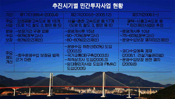 ◇MRG라는 뻔한 함정 = 그러나 법 제정 이후 5년 동안 실제 진행된 민자사업은 5건에 불과했다. 덜 알려지기도 했거니와 민간업자를 혹하게 할 만한 '매력점'이 없었기 때문이다. 그러던 차에 들이닥친 IMF 외환위기는 대한민국 민자사업에 여러모로 전환점이 됐다. 정부는 민자사업 활성화와 민간 건설업체 부양이라는 두 마리 토끼를 잡겠다며 그 유명한 '최소수입운영보장'(MRG)의 법적 근거를 마련한다. 거칠게 말해 건설업체를 '돕자고' 민자사업은 만들어졌다. IMF 외환위기라는 특수상황에서 민간사업자에게 절대 유리한 대한민국 고유의 민자사업 조항이 만들어진 것이다.