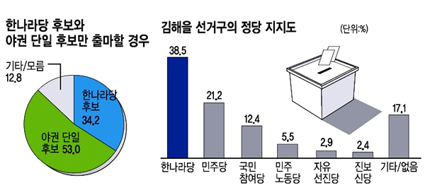 4·27김해을 보궐선거를 한달 정도 앞둔 상황에서 민주당 곽진업, 국민참여당 이봉수 후보 모두가 한나라당 김태호 후보와의 가상대결에서 앞선 것으로 나타났다.