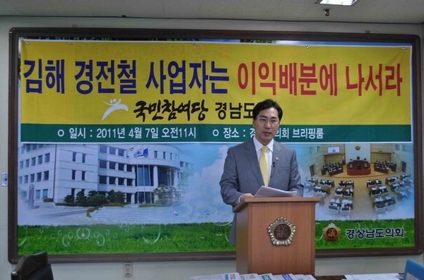공윤권(국민참여당·김해3·사진) 의원이 부산김해 경전철 사업자를 향해 "이익 배분에 나서라"고 촉구했다. 또한 "김해시와 현대산업개발·포스코건설 등이 중심이 된 민간사업자 간에 있을 추가 협상에서 MRG 인하가 이루어져야 한다"고 강조했다.