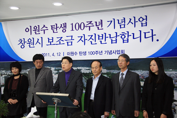기념사업회 정일근(시인·경남대 교수) 추진위원 등 위원들은 12일 오전 창원시청 프레스센터에서 열린 기자회견에서 "이번 사업에 대해 통합 창원시 시민들 사이에 찬반 논란으로 만들어지는 반목을 중단하기 위해 남은 사업비를 반납한다"면서 "시가 추진 중인 찬반 여론조사를 중단할 것"을 권했다.