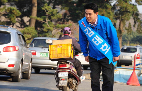 한나라당 김태호 후보는 예고대로 '나 홀로' 조용한 선거운동을 펼친 반면, 국민참여당 이봉수 후보는 당원과 함께한 출정식을 열며 '단일화' 분위기 확산에 애썼다. 김태호 후보는 애초 오전 6시 장유면 부곡초사거리에서 출근길 인사를 할 예정이었지만, 시간·장소를 변경해 오전 7시 조금 지나 장유면 부곡교회 앞에서 첫 일정을 시작했다. 선거운동원·수행원 없이 혼자 국도 변에 서서 인사를 건넸다. 총리 낙마한 지 이제 8개월가량 지났다는 점에서 조용히 유권자에게 다가가겠다는 것이다.