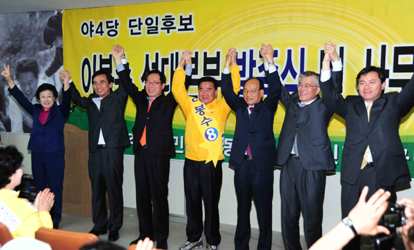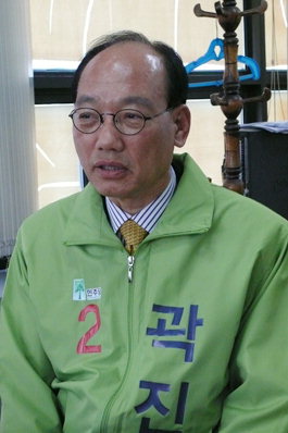 이봉수 후보 선거대책본부(이하 선대본) 발대식이 열렸던 지난 15일, 민주당 곽진업(사진) 후보가 이 행사에 참석했다. 곽 후보가 장유면에 있는 이봉수 후보 사무실에 들어서자 참여당 지지들은 '곽진업'을 연호하며 박수갈채를 보냈다.