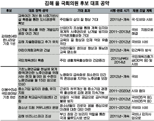 한나라당 김태호 '김해 지역 일꾼'…국민참여당 이봉수 '사람 사는 세상' 계승