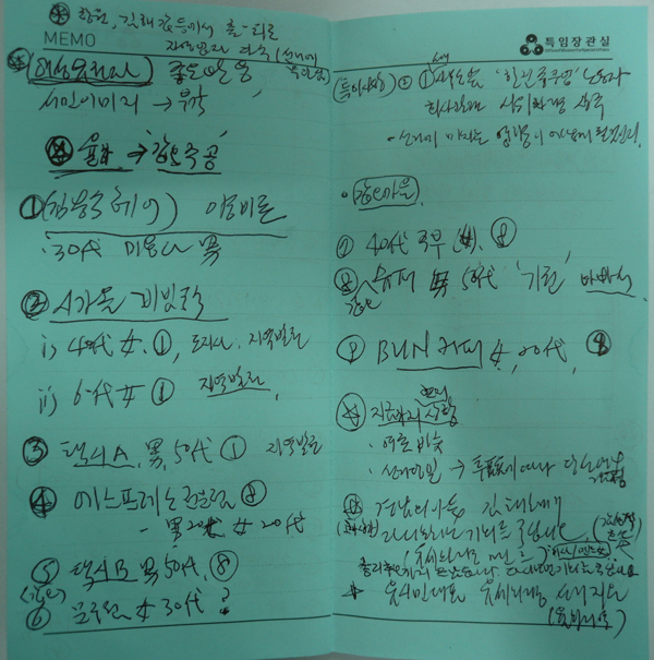 수첩의 주인공은 택시를 통해 '김해공항→롯데마트(식사)→갑오 주공(미장원)→코아상가→롯데마트' 등의 동선으로 움직인 것으로 보인다. 이 과정에서 전통시장 여론, 택시기사 여론, 미장원 여론, 여성 유권자 여론 등이 파악됐으며, 만난 사람들이 누구를 지지하는지도 기호로 표기돼 있었다.