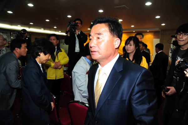 개표 시간 내내 모습을 드러내지 않았던 국민참여당 이봉수 후보는 투표 결과가 확정되자 개표 상황실에 모습을 드러냈다.
