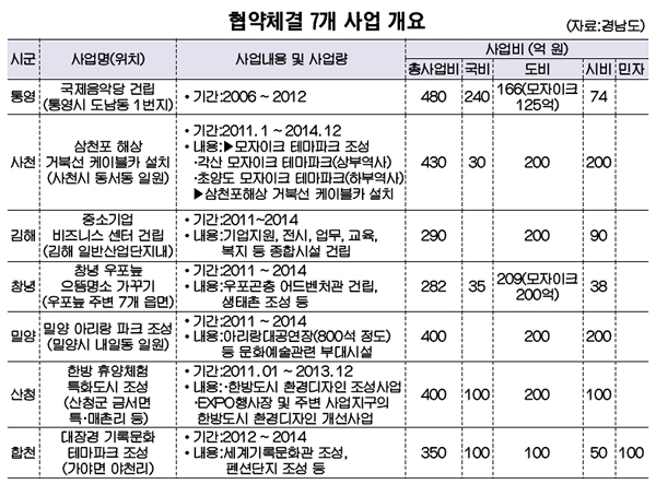 통영 국제음악당 건립, 김해 중소기업비즈니스센터 건립, 밀양 아리랑파크 조성, 창녕 우포늪 으뜸 명소 가꾸기, 산청 한방휴양체험특화도시 조성, 합천 대장경기록문화 테마파크 조성사업.