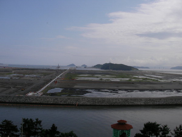 매립지가 점점 더 해안에 가까워졌다. 안성마을에서는 안골의 절반 거리로 다가왔다. 4공구 공사를 맡고 있는 대림산업 관계자는 이곳 매립지 호안 높이가 7m라고 했다. 마산만 매립지 호안 높이는 5.5m라고 했었다. 거리를 감안하면 그대로 모델이 된다. 특히, 매립지 바로 위쪽 흰돌메공원에서는 매립지를 단계별로 볼 수 있다. 쭈욱 돌아온 대로 안골-청안-안성-와성마을 앞까지는 복토를 거쳐 본격 성토 단계에 있다. 하지만, 오른쪽 수도마을 앞은 준설토 투기 상태에 머물러 있다. 이번 장마와 폭우로 투기장에는 다시 물이 가득하다. 문제의 깔따구 재발 현장이다. 정면 끝 쪽 송도와 연도 앞은 지금은 바다지만, 올 연말 준설토 투기가 시작된다. 서컨테이너 부두 개발 예정지이기 때문이다.