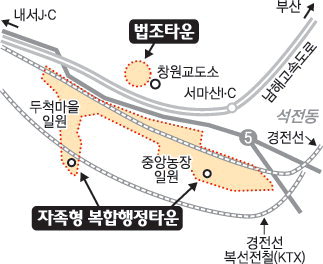 창원시 마산회원구 회성동 일대에 조성 예정인 법조타운을 포함한 '자족형 복합행정타운'. 준혁신도시 대안으로 추진돼 당시 김태호 도지사는 번듯한 청사진을 밝혔다.