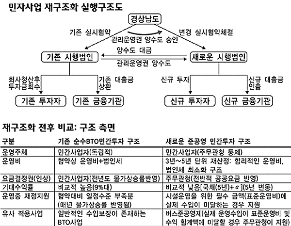 이때 경남도는 새로운 민간사업자와 실시협약을 새로 체결하고, 새로운 민간사업자는 새로운 투자자와 새로운 금융기관과 신규약정을 하게 되는데, 이것이 지금처럼 불합리한 높은 이자율과 법인세 문제를 해결할 수 있다는 것이다.