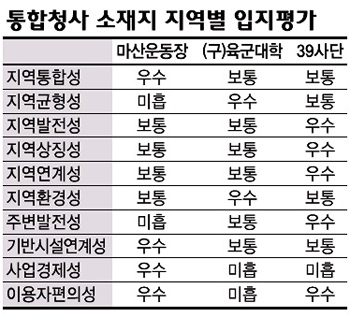 ◇알맹이 빠진 통합청사 소재지 용역 = 용역을 맡은 한국산업관계연구원(이하 연구원)은 마산운동장, 옛 육군대학 터, 39사단 부지 세 곳의 장단점을 비교하는 입지 타당성 조사를 했다. 연구원 관계자는 "타당성 조사는 90%만 완료됐다. 아직 10개 항목별 가중치를 두는 작업을 못해 우수 및 미흡 판정 개수는 큰 의미가 없다"고 말했다. 또 "통합준비위원회가 1순위와 2순위를 언급했기 때문에 그것을 존중하고자 한다"고 덧붙였다. 현실적으로 용역기관이 순위를 정하기 어렵다는 얘기다.