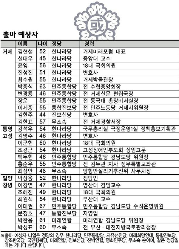 [4·11 총선 누가 뛰나] 거제, 통영·고성, 밀양·창녕