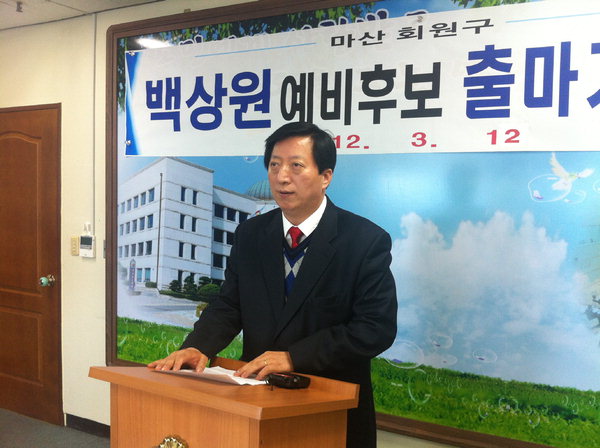 백상원 후보도 하 후보와 마찬가지로 '마산 역세권 개발'을 내세우고 있다. 다만, 총사업비 5000억 원으로 더 큰 규모를 계획하고 있다. 우선 주차장·도심공원 등 공공 부문 개발을 추진하고 나서 이후 유통·물류단지 및 상업·공공업무시설 등을 2020년까지 조성하겠다는 계획이다.