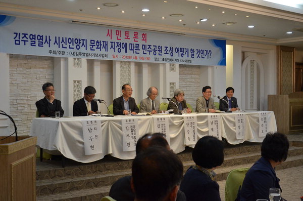 (사)김주열열사기념사업회(회장 백남해)는 지난 19일 '김주열 열사 시신인양지 문화재 지정에 따른 민주공원 조성 어떻게 할 것인가'라는 주제로 창원 사보이호텔에서 시민토론회를 열었다. 김영만 마산민주공원건립추진위원장과 창원대 남재우(사학과) 교수가 각각 주제 발표를 했고, 경남도민일보 김주완 편집국장과 창원시의회 송순호(통합진보당·내서읍) 의원, 시민 남두현 씨 등이 토론자로 나섰다.