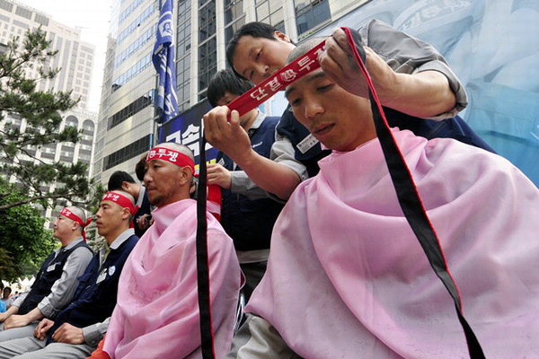 20일간 600㎞를 걸으며 신아sb RG 발급을 요구한 노동자 예진성 씨는 대표 6명이 삭발하는 모습을 제일 앞 자리에서 지켜보고 있었다. 예진성 씨와 함께 삭발을 보는 노동자들은 고개를 숙이거나 더러 흐느꼈다.협상을 마친 대표자가 협상 결렬을 알리자, 현장은 갑자기 침묵했다. 이어 삭발식이 진행됐다.