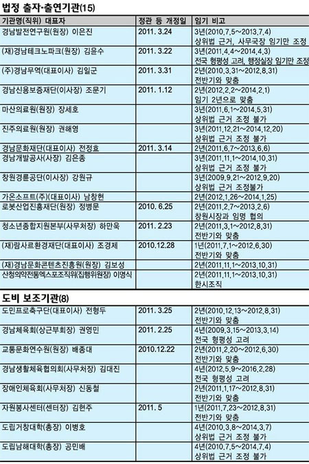 이에 따라 당시 도내 출자·출연기관 22곳(법정기관 14곳, 도비 보조기관 8곳, 현재 23곳) 가운데 상위법에 임기가 보장돼 조정할 수 없는 6개 기관(경남개발공사, 창원경륜공단, 마산의료원, 진주의료원, 도립거창대학, 도립남해대학)과 상위 중앙기관과의 형평성이나 한시 조직인 이유로 제외된 3곳(생활체육회, 가온소프트, 대장경천년세계문화축전)을 제외한 나머지 13개 기관장의 임기가 조정됐다.