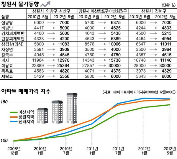 경남도 물가정보시스템 자료를 통해 마산지역의 개인서비스업종 가격 상승을 통합 전인 2010년 5월과 2012년 5월을 대조해 살펴보면 △설렁탕 5700원 →6375원 △냉면 5357원 →5500원 △김치찌개 4643원→5438원 △삼겹살 8576원→1만 1083원 △짬뽕 4000원→4683원으로 올랐다. 또 △미용료 2만 7857원→3만 원 △세탁료 5800원→6000원 등으로 상승했다.