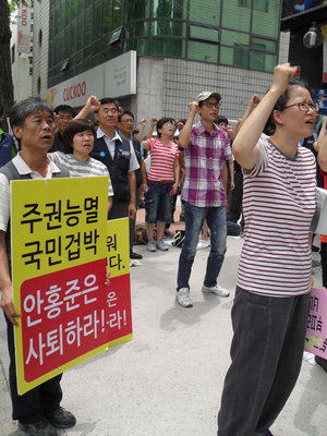 지난달 22일 안홍준 국회의원의 이민 발언 이후 열린사회희망연대 등 도내 시민단체와 야당 등은 연일 사퇴 촉구 집회를 열고, 마산역 앞에서 1인 시위를 벌이고 있다.