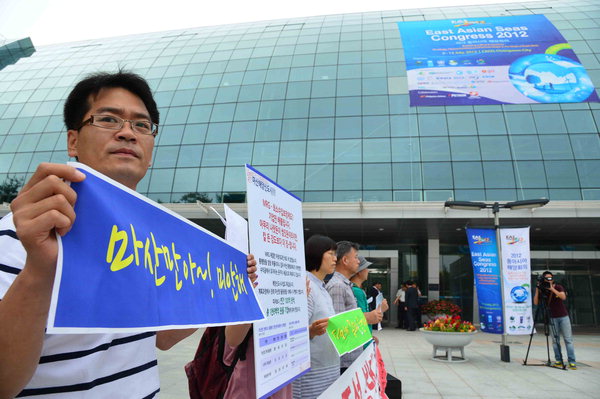 마산해양신도시건설사업반대시민대책위원회가 9일 오전 '2012 동아시아 해양회의'가 열리는 창원컨벤션센터 앞에서 마산만 매립 중단 촉구 기자회견을 했다.