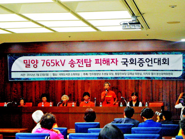 송전탑 건설을 반대하는 밀양지역 주민들이 23일 국회를 찾아 "제발 살려달라"고 호소했다. 민주통합당 초생달 모임, 통합진보당 김제남 의원실, 이치우 열사 분신대책위원회 주최로 이날 오전 국회도서관 소회의실에서 열린 '밀양 765kV 송전탑 피해자 국회 증언대회'에 참석한 밀양 주민들은 한목소리로 초고압 송전탑 건설공사를 반대한다고 외쳤다.