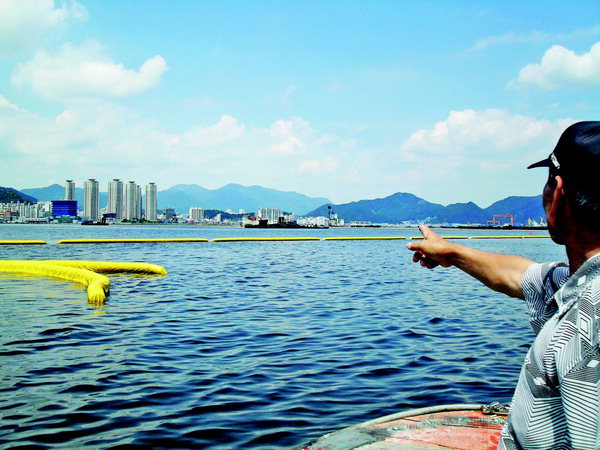 세팅바지선 위 굴착기 두 대가 돌덩이들을 마산 앞바다에 투하했다. 신마산어촌계(계장 이정식)는 지난 22일 해운동 SK저유소에 진입하는 선박이 오탁방지막에 부딪히는 사고가 발생해 오탁방지막 절반이 파손됐다. 현장을 찾은 24일 부서진 오탁방지막은 물때와 바람에 따라 여기저기 움직이며 돝섬여객선 등을 위협하고 있었다.