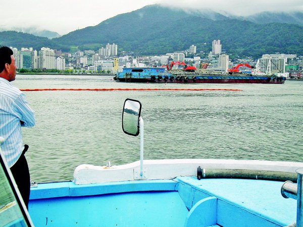 선장 안영강 씨는 "창원시가 오탁방지막을 피해 다니라고 표시해 둔 부표가 바람과 파도에 따라 조금씩 움직인다. 혹여 배에 걸릴까 노심초사다. 그동안 세 번이나 스크루에 부표 줄이 감기기도 했다"며 "또 모래를 퍼붓는 바지선이 위치를 옮길 때마다 뱃길도 조금씩 달라지고 있어 위험하다. 늘 긴장하고 있다"고 했다.