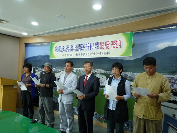 마산해양신도시 건설사업 반대 시민대책위원회는 지난 5일 창원시청 프레스센터에서 기자회견을 열어 "창원시가 조례로 정해진 시정정책 토론 청구를 기각한 것은 부당하다"고 주장했다.