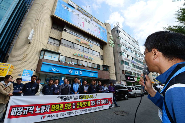 이날 민주노총 경남본부와 경남진보연합, 경남시민사회단체연대회의, 비정규직없는경남만들기공동행동 등 4개 사회단체는 창원시 새누리당 경남도당 앞에서 투표시간 연장을 반대하는 새누리당을 규탄했다.