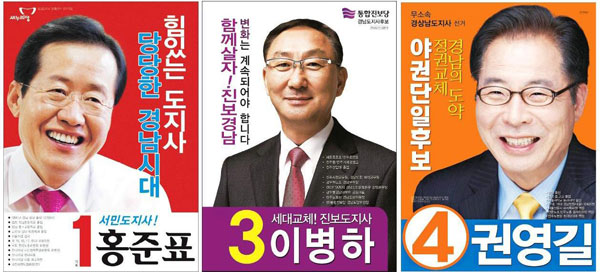 본선에 들어오니 사정이 달라졌다. 도지사 보궐선거가 대선에 묻혀 '묻어가는 선거'가 될 것이라던 우려는 기우였다. 정치 고단수 홍준표(새누리당)-권영길(무소속) 후보 간 '빅매치'가 성사된 게 큰 몫을 했다. 선거 초반부터 하루가 멀다고 쟁점들이 쏟아져 나오고 있다.