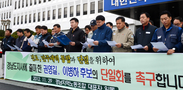 도내 금속산업 주요 사업장 노조 대표자들은 29일 오전 도청 현관 앞에서 기자회견을 열고 통합진보당 이병하 후보와 무소속 권영길 후보의 단일화를 촉구했다.