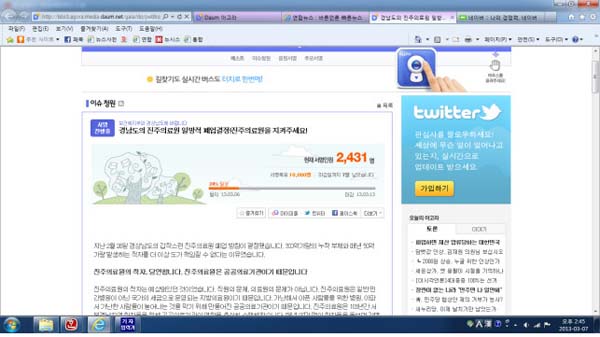 보건의료노조는 지난 6일 포털 사이트 다음 아고라 게시판에 진주의료원 폐업을 반대하는 내용의 청원글을 올리면서 포털 사이트에서도 진주의료원 구명운동이 시작됐다.