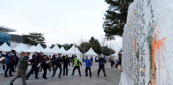 이날 오후에는 창원지역 22개 시민사회단체로 구성된 '마산역 광장 이은상시비 철거를 위한 대책위원회'가 마산역 가고파 이은상 시비 앞에서 집회를 열고, 시비에 계란과 밀가루를 투척하는 퍼포먼스를 벌였다.