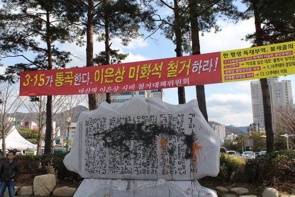 마산역 광장에 설치된 '가고파 이은상 시비'가 점점 흉물화되고 있다. 하지만 시비 건립을 추진한 측(마산역·남마산 로타리 클럽)과 '마산역 광장 이은상 시비 철거대책위'의 의견 대립은 팽팽하다.