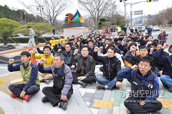 이날 낮 12시 40분께 이들은 경남도청 정문 현관으로 이동해 조합원 200여 명의 관련 조례 개정 반대 의견서를 홍 지사에게 직접 전달하려고 했다. 하지만 경찰과 청원경찰이 정문을 막아 전달을 보류했다.