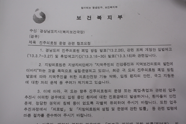공문에는 “진주의료원 폐업 방침 발표에 따라 지역주민을 위한 의료안전망 기능 약화, 입원환자의 안전, 국고지원분에 대한 처리 문제 등에 우려가 제기되고 있다”며 “폐업이 결정된 경우에도 ‘보조금 관리에 관한 법률’ 및 ‘지역거점공공병원 기능보강 국고지원사업 지침’에 의해 의료원의 중요재산의 양도·대여 등을 하는 경우 보건복지부의 승인이 필요하고 이 경우 기 교부된 국고보조금 환수 등 조건이 부가될 수 있음을 알린다”고 명시됐다.