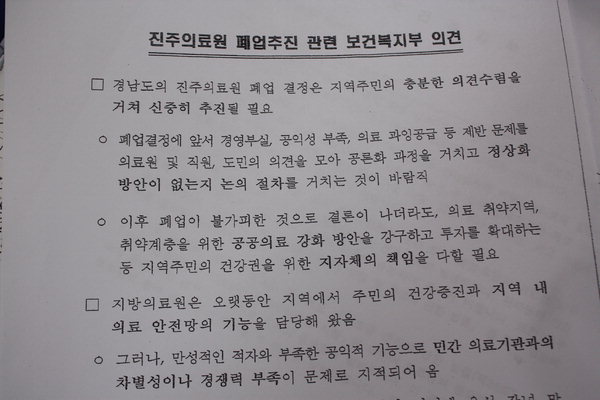 사실상 폐업 재검토를 요구한 것으로, 지난 25일 홍준표 지사와 진영 장관의 면담 때 이 같은 뜻이 전달된 데 이어 전국 이슈로 확산한 진주의료원 폐업 사태에 공문을 통해 보건복지부 입장을 명확히 전달한 것으로 보인다.