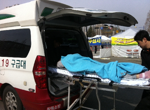 진주의료원 폐업 방침에 항의해 경남도청 정문 앞 천막에서 단식 농성 중이던 진주의료원 직원 2명이 쓰러져 병원으로 옮겨졌다.