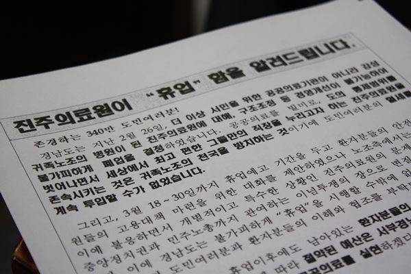 윤성혜 복지보건국 국장은 3일 오후 2시 30분 도청 프레스센터에서 "진주의료원은 더는 서민을 위한 공공의료기관이 아니라 강성 귀족노조의 병원"이라며 "도의 통제범위를 존속시키는 것은 귀족노조의 천국을 방치하는 것이기에 혈세를 계속 투입할 수가 없다"고 휴업 이유를 밝혔다.