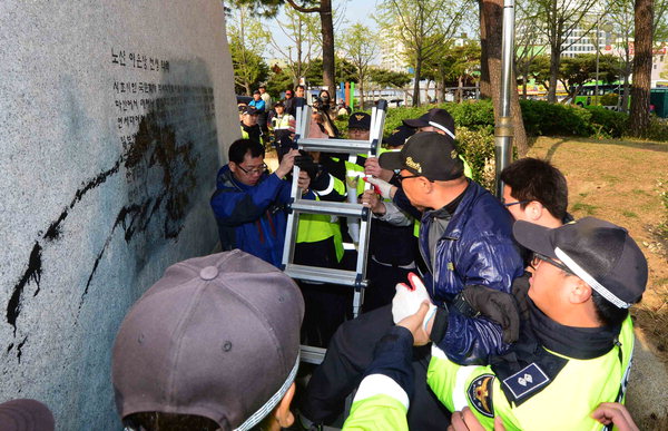 ◇"반드시 철거하겠다" = 철거대책위와 창원지역 시민사회단체 회원 50여 명은 19일 마산역 광장에 모여 이은상 시비를 철거할 계획이었다. 이를 위해 크레인도 준비했다.