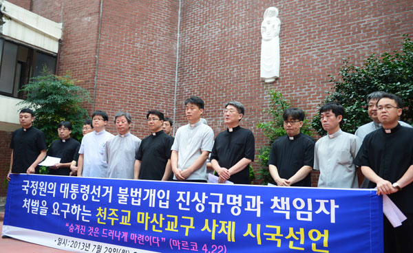 천주교 마산교구에 소속된 77명의 신부가 국가정보원의 대통령 선거 개입 의혹과 관련해 시국선언문을 발표하고 "진상을 철저히 규명하고 책임자를 처벌하라"고 밝혔다. 또한 "박근혜 대통령은 국기문란 행위에 대해 국민 앞에 사죄하라"고 촉구했다.