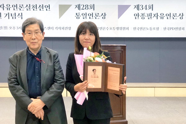 본보 최환석·김다솜 기자의 '노동자의 외침, 메이데이 연속 기획 보도'가 24일 서울 프레스센터에서 열린 '안종필 자유언론상 시상식'에서 특별상을 받았다. 심사위는 "지역 언론으로서 거대 재벌에 맞선 노동인권 보도는 의제화하기 어려운 사안임에도 굽히지 않은 점을 높이 샀다"고 밝혔다.