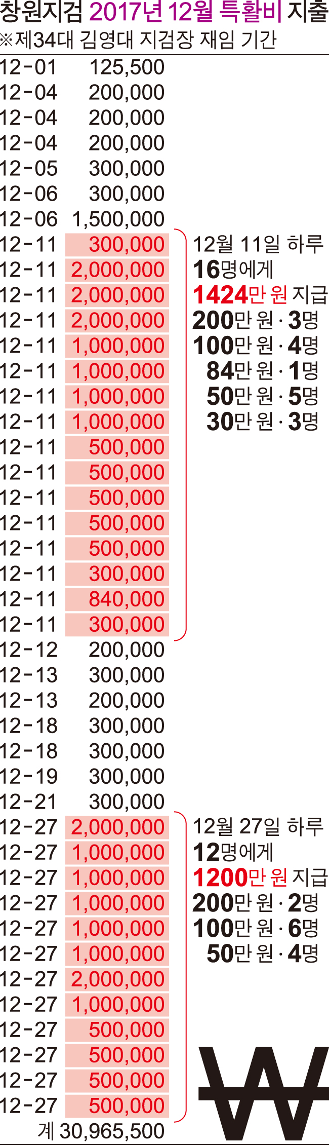 이 같은 정황은 여러 군데에서 발견된다. 일례로 창원지검은 제34대 김영대 전 지검장(2020년 8월 서울고등검찰청 검사장 퇴임) 재임 기간이자 시기상 연말인 2017년 12월에만 3096만 5500원을 썼다. 특활비 지출내역기록부 검사장 확인란에는 '김영대' 검사장 서명이 지워지지 않고 공개됐다. 특히 그해 12월 27일 하루에 12명에게 1200만 원(200만 원 2명, 100만 원 6명, 50만 원 4명)을 집행했다.