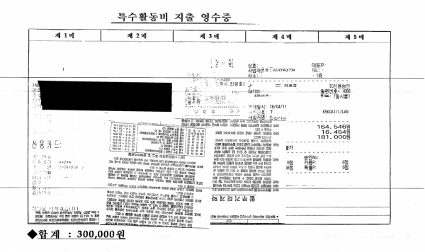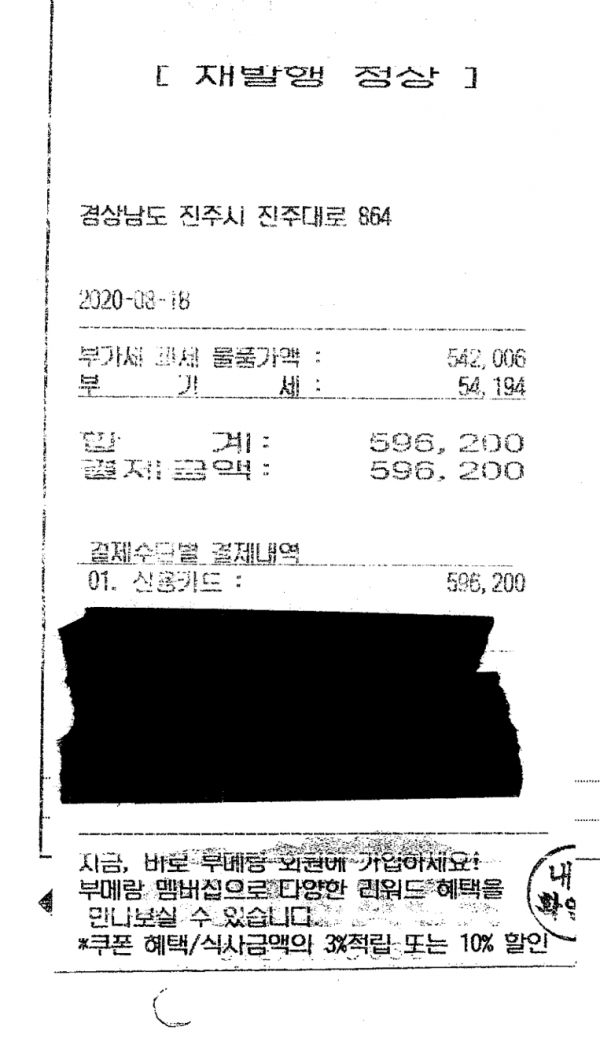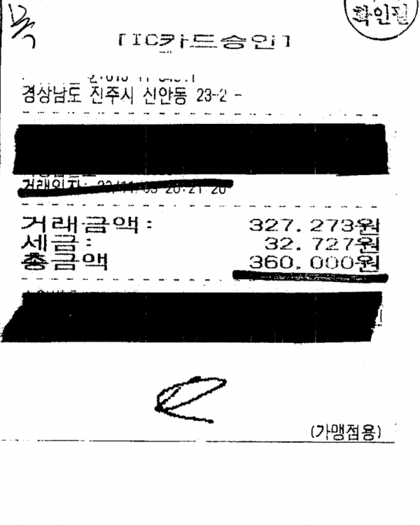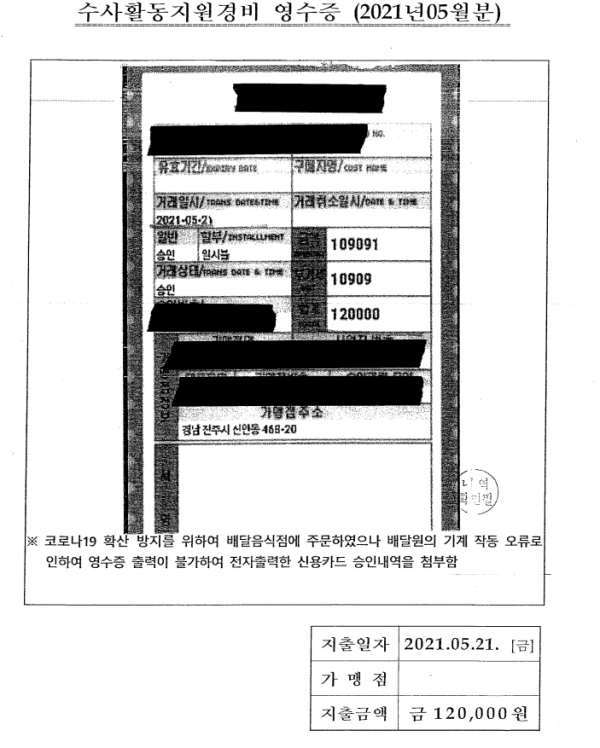 이런 사실은 5월 21일 거래 내역 중 진주시 신안동 ‘대한아구찜’에서 12만 원을 결제한 영수증에서 드러난다. 영수증을 보면 어떤 음식을 주문했는지는 남아있지 않지만, 코로나 확산 방지 차원에서 배달 음식을 시켰다는 내용을 확인할 수 있다.